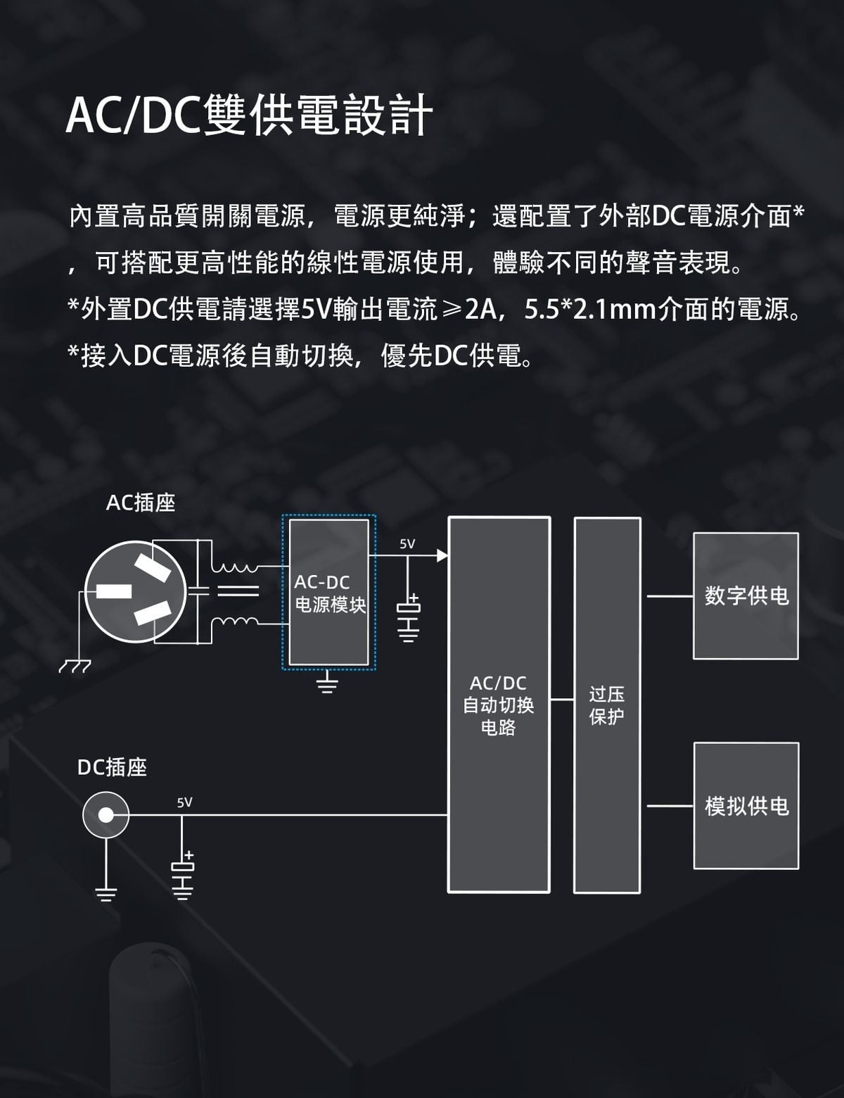 內置高品質開關電源,電源更純淨;還配置了外部DC電源介面*,可搭配更高性能的線性電源使用,體驗不同的聲音表現。