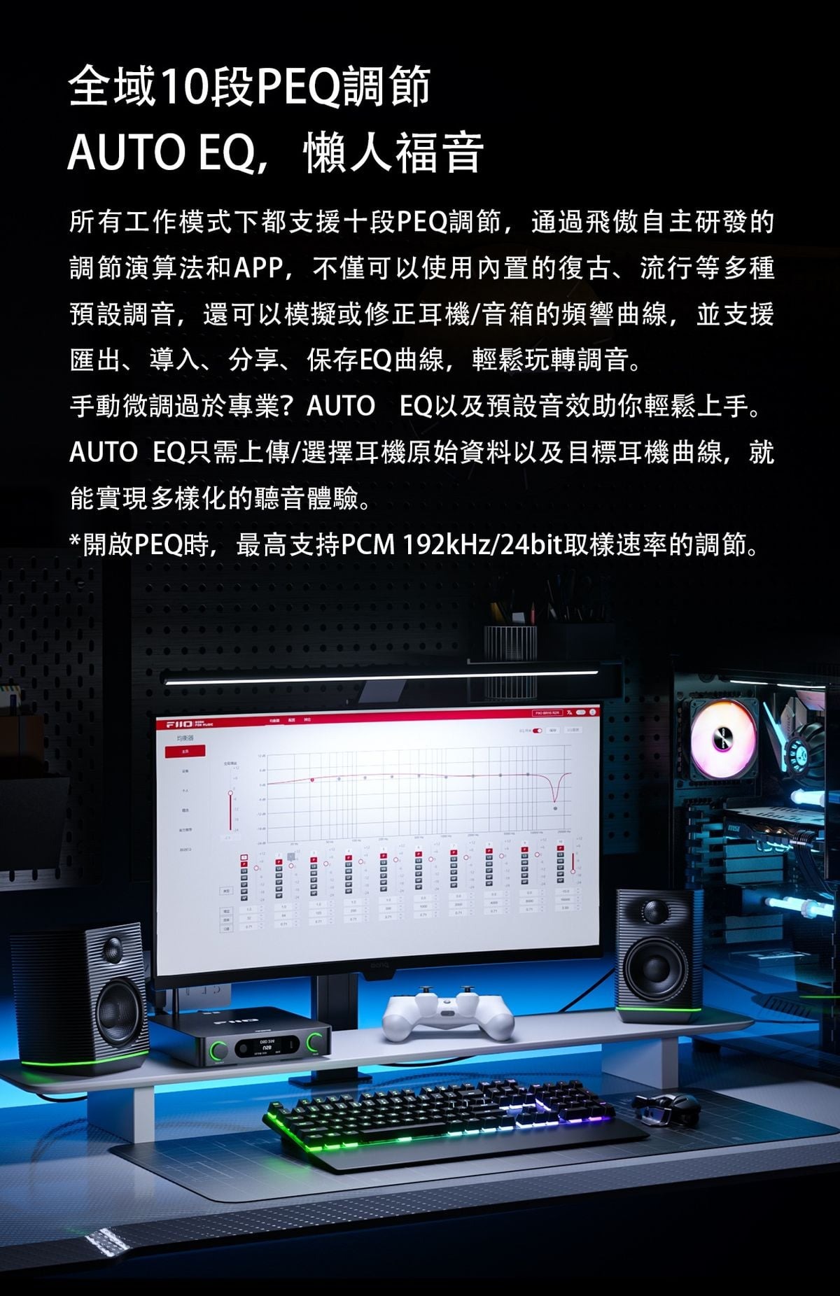 所有工作模式下都支援十段PEQ調節,通過飛傲自主研發的調節演算法和APP,不僅可以使用內置的復古、流行等多種預設調音,還可以模擬或修正耳機/音箱的頻響曲線,並支援匯出、導入、分享、保存EQ曲線,輕鬆玩轉調音。