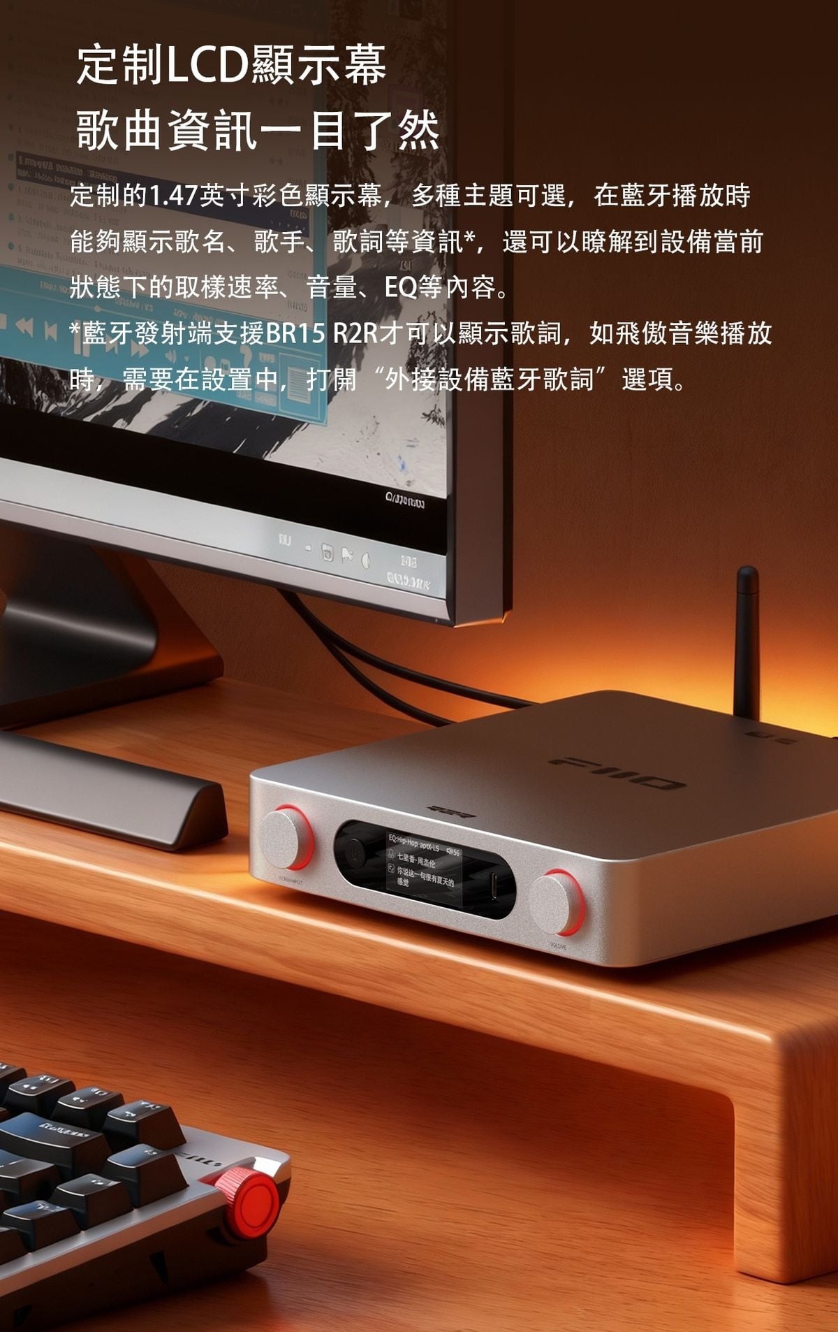 定制的1.47英寸彩色顯示幕,多種主題可選,在藍牙播放時能夠顯示歌名、歌手、歌詞等資訊*,還可以瞭解到設備當前狀態下的取樣速率、音量、EQ等內容。