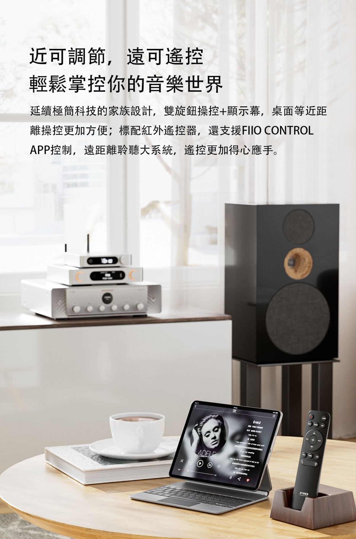 延續極簡科技的家族設計,雙旋鈕操控+顯示幕,桌面等近距離操控更加方便;標配紅外遙控器,還支援FIIO CONTROL APP控制,遠距離聆聽大系統,遙控更加得心應手。