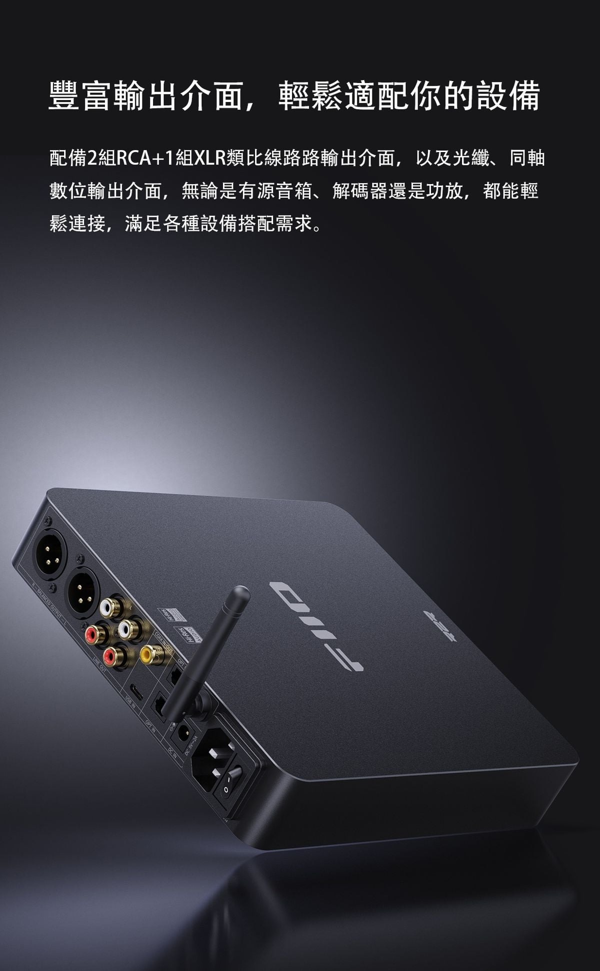 配備2組RCA+1組XLR類比線路路輸出介面,以及光纖、同軸數位輸出介面,無論是有源音箱、解碼器還是功放,都能輕鬆連接,滿足各種設備搭配需求。