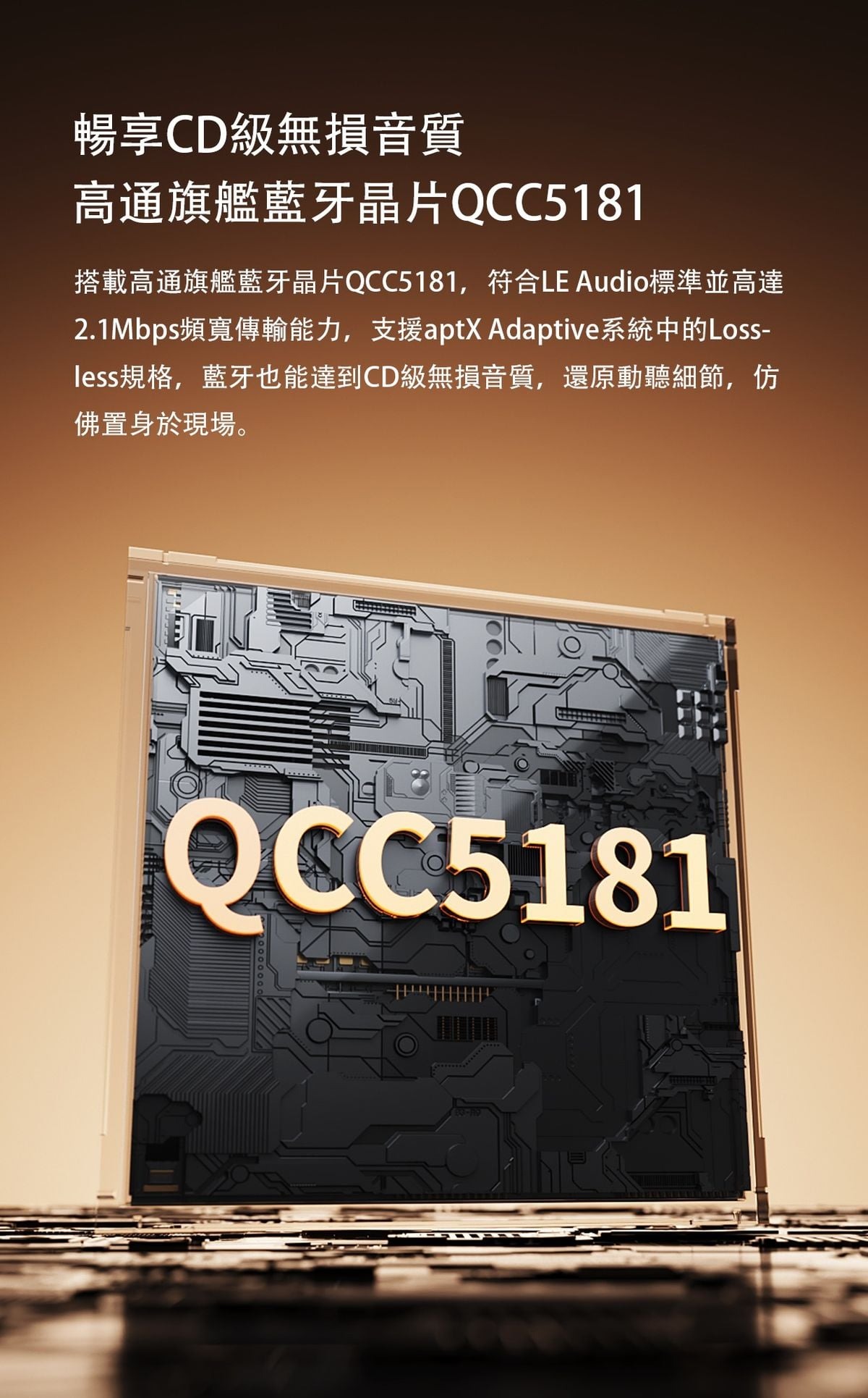 搭載高通旗艦藍牙晶片QCC5181,符合LE Audio標準並高達2.1Mbps頻寬傳輸能力,支援aptX Adaptive系統中的Lossless規格,藍牙也能達到CD級無損音質,還原動聽細節,仿佛置身於現場。