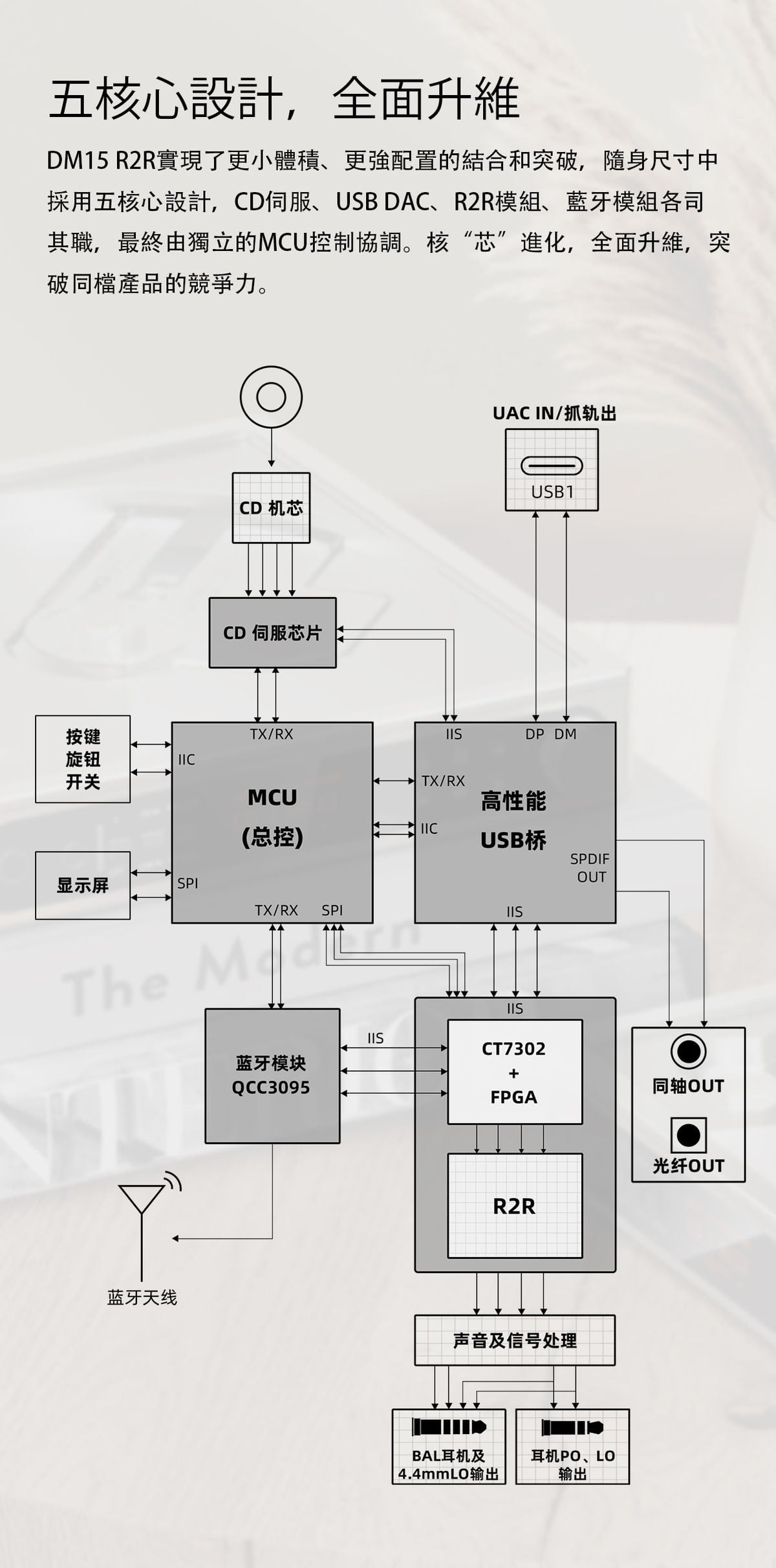 DM15 R2R實現了更小體積、更強配置的結合和突破,隨身尺寸中採用五核心設計,CD伺服、USB DAC、R2R模組、藍牙模組各司其職,最終由獨立的MCU控制協調。核“芯”進化,全面升維,突破同檔產品的競爭力。