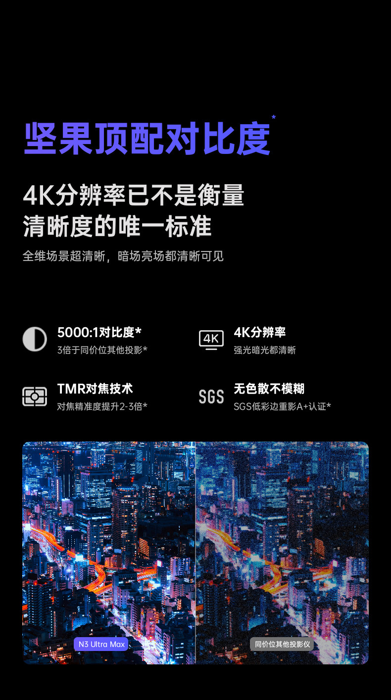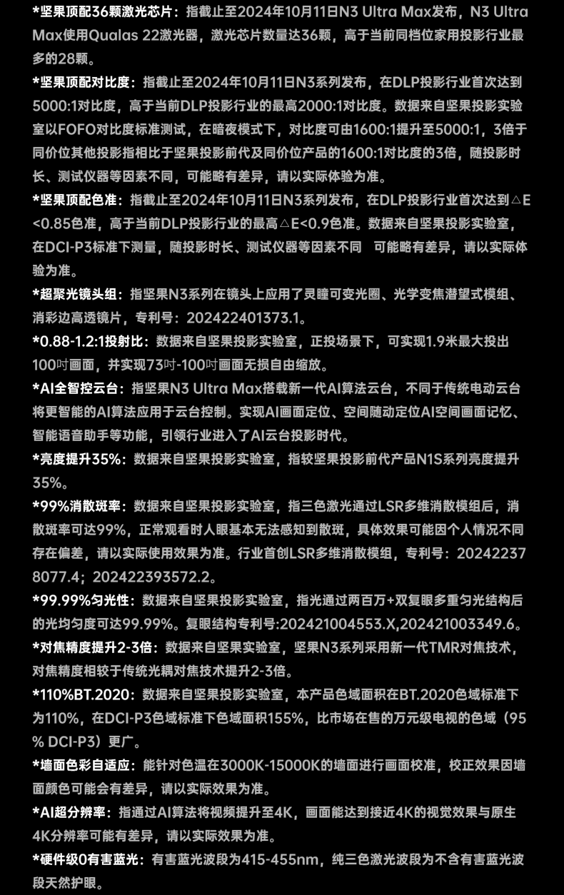 – 全新一代MALC目氪3.0純三色激光引擎,徹底激發三色激光潛力,搭配全新一代“超聚光鏡頭組” -儲存空間:N3 Ultra Max配備了128GB儲存空間,對於需要大量儲存4K內容的使用者 – 擁有高達4600CVIA亮度,擁有5000:1對比度,超清4K分辨率物理4K解析度搭配110%的BT.2020色域,每一幀畫面都細膩生動,色彩飽滿,如同身臨其境。 – 電動雲台設計:360度旋轉功能,讓你輕鬆調整投影角度,無需手動操作,即可找到最佳觀影位置 – JMGO音響與強大配置:內建音響系統與MT9679晶片,以及Wi-Fi 6、HDMI 2.1等豐富接口,讓N3 Ultra不僅音畫俱佳,連接也更加便捷 – 香港三腳英規插頭